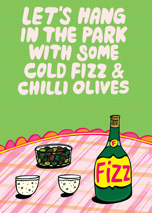 Let's Hang Out In The Park With Some Cold Fizz & Chilli Olives - Greeting Card