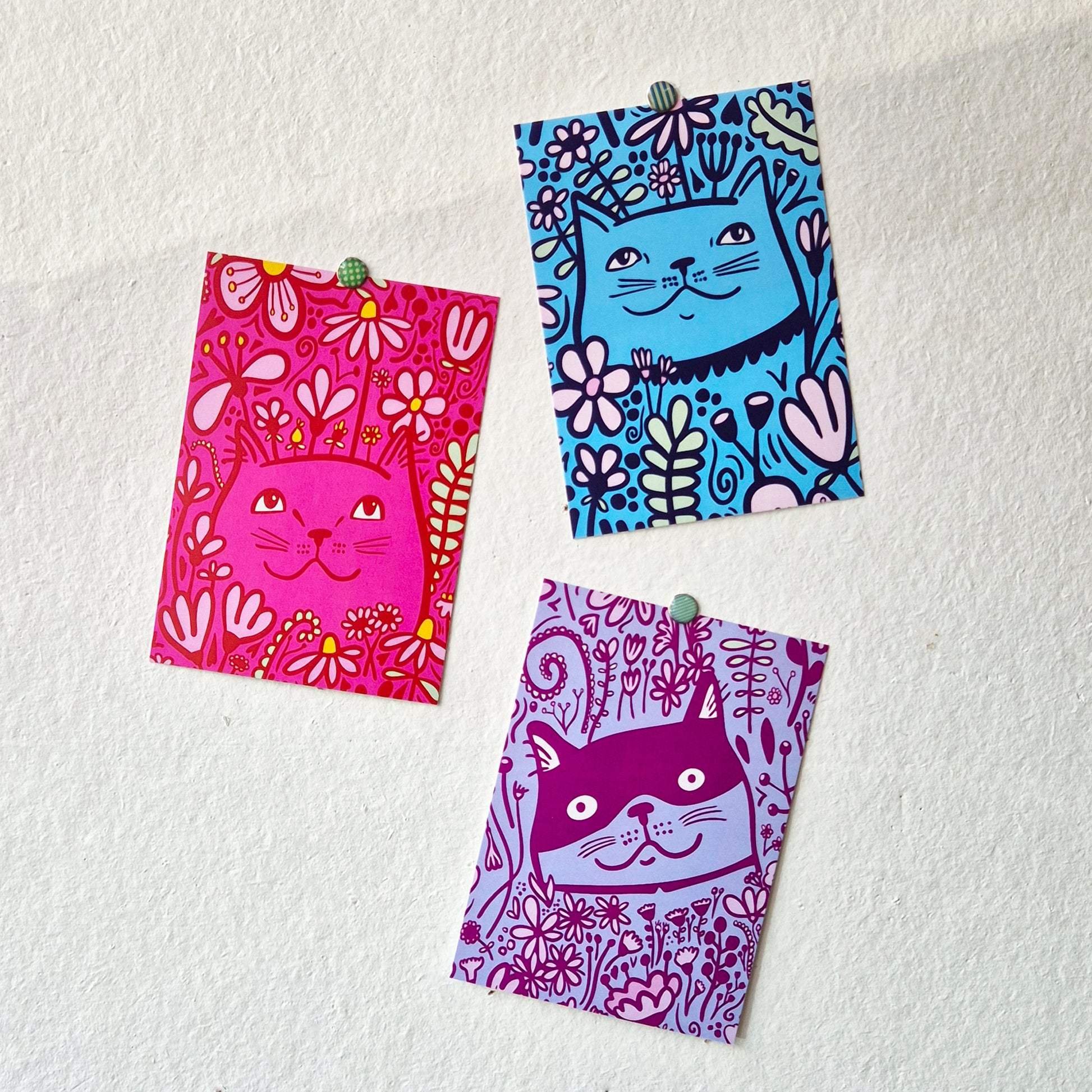 Each postcard features a cute floral cat artwork with bright and fun colours.