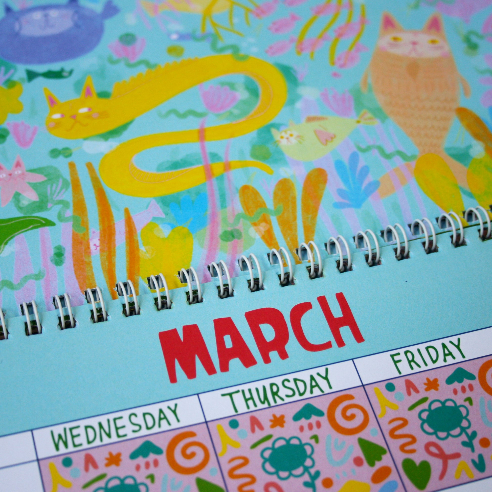 We love to fill our kitty calendar with fun and bright illustrations that will bring cat lovers joy. Each illustration is created in Procreate on the Ipad and when then print and bind the calendar in our Brunswick Studio.