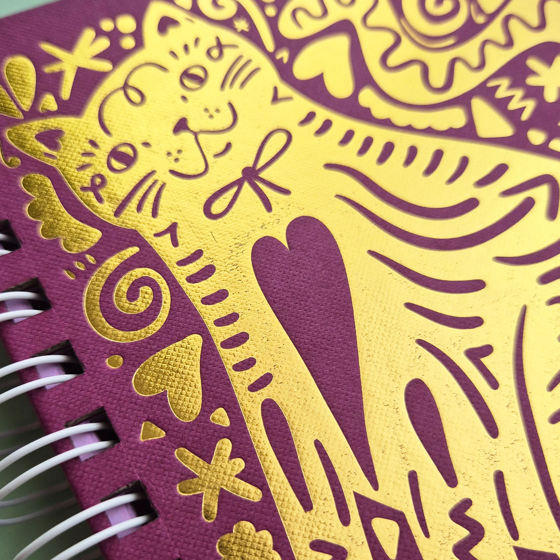 The berry cover features a gold foiled cat surrounded by different shapes and patterns, with the back the same berry hardcover with no design.