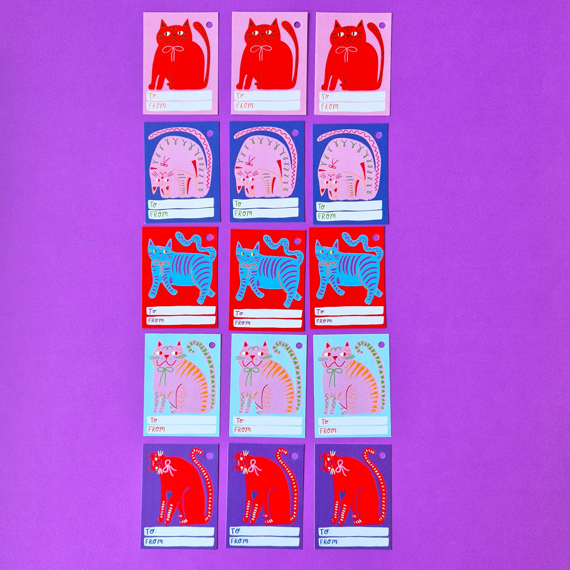 A pack of 15 gift tags featuring five different cat themed designs.